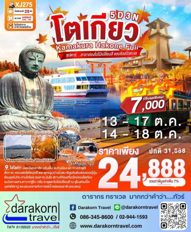 โปรไฟไหม้ ทัวร์ญี่ปุ่น โตเกียว ฮาโกเน่ ฟูจิ 5วัน3คืน โปรแรง ลดราคาสูงสุด 7000 จองด่วน Posted on October 1, 2025 by Sales Darakorn Travel 01 Oct ทัวร์ญี่ปุ่น โตเกียว ฮาโกเน่ ฟูจิ 5วัน3คืน โปรแรง ลดราคาสูงสุด 7000 จองด่วน นั่งรถไฟคลาสสิค เอโนเด็น สักการะหลวงพ่อโตไดบุทสึ ชมวิวทะเลสาบคาวากูจิโกะ วันเดินทาง 13-17/14- 18 ต.ค. 68 จากราคา 31,888.- เหลือเพียง 24,888.- Facebook iconFacebookTwitter iconTwitterLINE iconLine Sales Darakorn Travel ทัวร์ญี่ปุ่น โอซาก้า อูจิ แหล่งชาเขียว 5วัน3คืน โปรแรง ลดราคาสูงสุด 8000 จองด่วน 10 ที่สุดท้าย