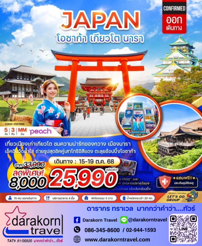 โปรไฟไหม้ ทัวร์ญี่ปุ่น โอซาก้า เกียวโต นารา 5วัน3คืน โปรแรง ลดราคาสูงสุด 8000 จองด่วน Posted on October 6, 2025October 6, 2025 by Sales Darakorn Travel 06 Oct ทัวร์ญี่ปุ่น โอซาก้า เกียวโต นารา 5วัน3คืน โปรแรง ลดราคาสูงสุด 8000 จองด่วน เที่ยวเมืองเก่าเกียวโจ ชมความน่ารักของกวาง เช็คอินหมู่บ้านวัดน้ำใส ถ่ายรูปคู่เสาโทริอิสีแดง ตะลุยช้อปปิ้งโอซาก้า วันเดินทาง 15 – 19 ต.ค. 68 จากราคา 33,990.- เหลือเพียง 25,990.- Facebook iconFacebookTwitter iconTwitterLINE iconLine Sales Darakorn Travel ทัวร์ญี่ปุ่น โตเกียว นาริตะ ฟูจิ ชมดอกใครเชีย 5วัน4คืน โปรแรง ลดราคาสูงสุด 8000 จองด่วน ทัวร์ญี่ปุ่น โตเกียว ฮาเนดะ ฟูจิ อิบารากิ ใบไม้เปลี่ยนสี 6วัน4คืน โปรแรง ลดราคาสูงสุด 4000 จองด่วน