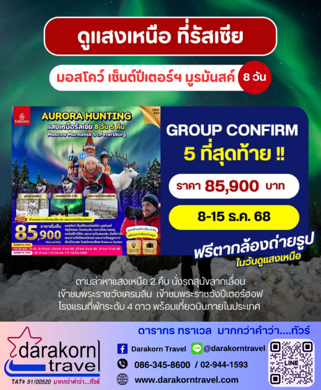โปรไฟไหม้ ทัวร์รัสเซีย Aurora Hunting 8วัน5คืน โปรแรง 5 ที่สุดท้าย Posted on October 6, 2025October 6, 2025 by Sales Darakorn Travel 06 Oct ทัวร์รัสเซีย Aurora Hunting 8วัน5คืน โปรแรง 5 ที่สุดท้าย ตามล่าหาแสงเหนือ 2 คืน นั่งรถสุนัทลากเลื่อน พระราชวังเครมลิน พระราชวังปีเตอร์ฮอฟ วันเดินทาง 08 – 15 ธ.ค. 68 จากราคา 85,900.- เหลือเพียง 85,900.- Facebook iconFacebookTwitter iconTwitterLINE iconLine Sales Darakorn Travel ทัวร์ไต้หวัน เถาหยวน เจียอี้ อาลีซาน ผิงซี ไทเป 5วัน4คืน โปรแรง ลดราคาสูงสุด 2000 จองด่วน ทัวร์มาเก๊า Shimlong 3วัน2คืน โปรแรง ราคาโปรสุดๆ จองด่วน