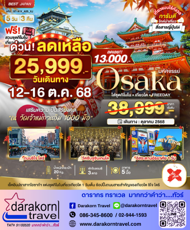 โปรไฟไหม้ ทัวร์ญี่ปุ่น โอซาก้า ใส่ชุดกิโมโน เกียวโต FREEDAY 5วัน3คืน โปรแรง ลดราคา 13000 บาท จองด่วน Posted on October 7, 2025 by Sales Darakorn Travel 07 Oct ทัวร์ญี่ปุ่น โอซาก้า ใส่ชุดกิโมโน เกียวโต FREEDAY 5วัน3คืน โปรแรง ลดราคา 13000 บาท จองด่วน วัดเจ้าแม่กวนอิม 1000 มือ วัดซันจูซันเกนโด ปราสาทโอซาก้า ใส่ชุดกิโมโน ช้อปปิ้งถนนชิโจ โดริ วันเดินทาง 12 – 16 ต.ค.68 จากราคา 59,900.- เหลือเพียง 53,900. Facebook iconFacebookTwitter iconTwitterLINE iconLine Sales Darakorn Travel ทัวร์รัสเซีย Aurora Hunting 8วัน5คืน โปรแรง 5 ที่สุดท้าย ทัวร์จีน จางเจียเจี้ย ฟูหรงเจิ้น ภูเขาเจ็ดดาว 5วัน4คืน โปรแรง ลดราคา 5000 บาท จองด่วน