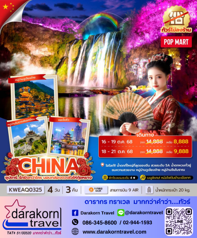 โปรไฟไหม้ ทัวร์จีน ดวงใจให้กุ้ยหยาง โปรดีลดราคาสูงสุด 5000 บาท จองด่วน Posted on October 14, 2025 by Sales Darakorn Travel 14 Oct ทัวร์จีน ดวงใจให้กุ้ยหยาง โปรดีลดราคาสูงสุด 5000 บาท จองด่วน น้ำตกที่ใหญ่ที่สุดของจีน น้ำตกหวงกั่วซู่ หมู่บ้านวูเจียงอ้าย หมู่บ้านจีนโบราณ วันเดินทาง 16-19/18-21 ต.ค.68 จากราคา 14,888.- เหลือเพียง 8,888./9,888.- Facebook iconFacebookTwitter iconTwitterLINE iconLine Sales Darakorn Travel ทัวร์จีน ซุปตาร์ ณ เมืองเฟือง 4วัน3คืน โปรแรง ลดราคา 2000 บาท จองด่วน