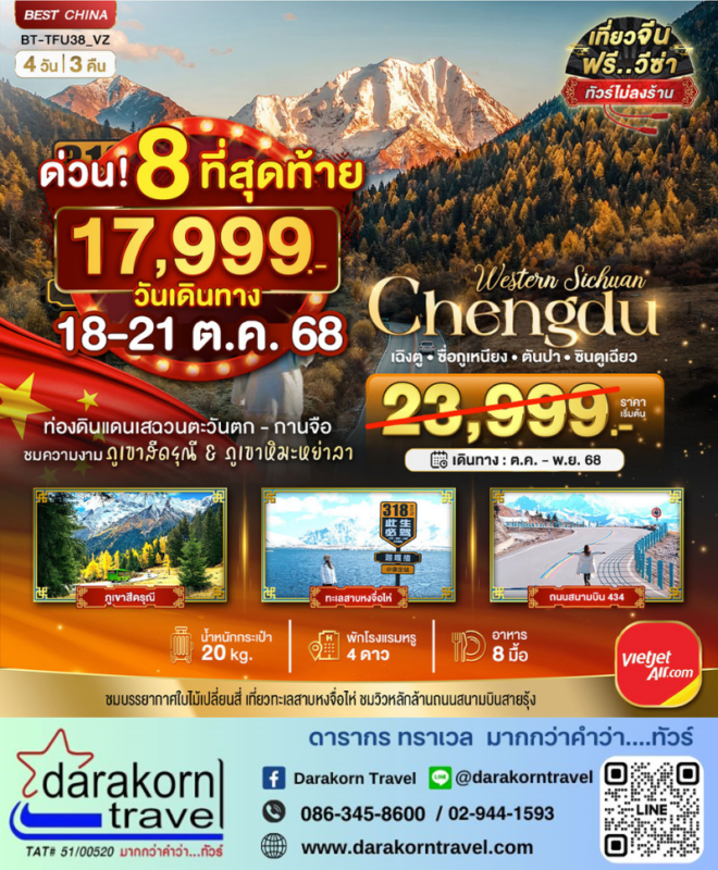 โปรไฟไหม้ ทัวร์จีน เฉิงตู ซื่อกูเหนียง ตันปา ซินตูเฉียว 4วัน3คืน โปรแรง ลดราคา 6000 บาท จองด่วน Posted on October 16, 2025 by Sales Darakorn Travel 16 Oct ทัวร์จีน เฉิงตู ซื่อกูเหนียง ตันปา ซินตูเฉียว 4วัน3คืน โปรแรง ลดราคา 6000 บาท จองด่วน ภูเขาสี่ดรุณี ทะเลสาบหงจื่อไห่ ถนนสนามบิน 434 ภูเขาหิมะหย่าลา วันเดินทาง 18 – 21 ต.ค. 68 จากราคา 23,999.- เหลือเพียง 17,999. Facebook iconFacebookTwitter iconTwitterLINE iconLine Sales Darakorn Travel ทัวร์จีน เฉิงตู ภูเขาสี่ดรุณี 5วัน4คืน โปรแรง ลดราคา 2000 บาท จองด่วน