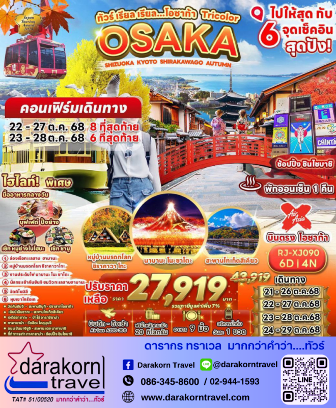 โปรไฟไหม้ ทัวร์ญี่ปุ่น เรียล เรียล โอซาก้า Tricolor 6วัน4คืน โปรแรง ลดราคา 16000 บาท จองด่วน Posted on October 17, 2025 by Sales Darakorn Travel 17 Oct ทัวร์ญี่ปุ่น เรียล เรียล โอซาก้า Tricolor 6วัน4คืน โปรแรง ลดราคา 16000 บาท จองด่วน หมู่บ้านชิราคาวาโกะ นาบานะโนะซาโตะ สะพานโทเก็ตสึเคียว ปราสาทโอซาก้า วันเดินทาง 21/22/23/24 ต.ค.68 จากราคา 43,919.- เหลือเพียง 27,919. Facebook iconFacebookTwitter iconTwitterLINE iconLine Sales Darakorn Travel ทัวร์ญี่ปุ่น เรียล เรียล โตเกียว พาไปดู ส้มแดงเหลือง 5วัน3คืน โปรแรง ลดราคา 7000 บาท จองด่วน ทัวร์ญี่ปุ่น เรียล เรียล โอซาก้า ใบไม้เปลี่ยนสี 6วัน4คืน โปรแรง ลดราคา 8000 บาท จองด่วน