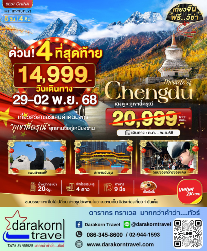 โปรไฟไหม้ ทัวร์จีน เฉิงตู ภูเขาสี่ดรุณี 5วัน4คืน โปรแรง ลดราคา 6000 บาท จองด่วน 4 ที่สุดท้าย Posted on October 20, 2025 by Sales Darakorn Travel 20 Oct ทัวร์จีน เฉิงตู ภูเขาสี่ดรุณี 5วัน4คืน โปรแรง ลดราคา 6000 บาท จองด่วน 4 ที่สุดท้าย อุทยานภูเขาสี่ดรุณี แพนด้าเซลฟี่ สะพานอันชุน ถนนซอยกว้างซอยแคบ วันเดินทาง 29 ตุลาคม – 02 พ.ย.68 จากราคา 20,999.- เหลือเพียง 14,999. Facebook iconFacebookTwitter iconTwitterLINE iconLine Sales Darakorn Travel ทัวร์จีน ต้าหลี่ ลี่เจียงแชงกรีล่า 6วัน5คืน โปรแรง ลดราคา 5000 บาท จองด่วน 6 ที่สุดท้าย ทัวร์ญี่ปุ่น โตเกียว อิบารากิ 6วัน4คืน โปรแรง ลดราคา 11000 บาท จองด่วน