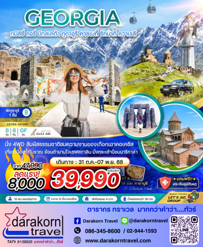 โปรไฟไหม้ ทัวร์จอร์เจีย ทบิลิซี่ กูดาอูรี 8วัน6คืน โปรแรง ลดราคา 8000 บาท จองด่วน Posted on October 21, 2025 by Sales Darakorn Travel 21 Oct ทัวร์จอร์เจีย ทบิลิซี่ กูดาอูรี 8วัน6คืน โปรแรง ลดราคา 8000 บาท จองด่วน ชมความงามของเทือกเขาคอเคซัส นั่งกระเช้าป้อมนาริกาล่า เที่ยวเมืองถ้ำโบราณ ย้อนตำนานโจเซฟสตาลิน วันเดินทาง 31ต.ค. – 07 พ.ย. 68 จากราคา 47,990.- เหลือเพียง 39,990. Facebook iconFacebookTwitter iconTwitterLINE iconLine Sales Darakorn Travel ทัวร์ญี่ปุ่น โอซาก้า โอบาระ 6วัน4คืน โปรแรง ลดราคา 16000 บาท จองด่วน