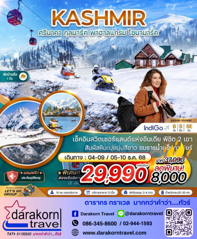 โปรไฟไหม้ ทัวร์อินเดีย แคชเมียร์ กุลมาร์ค พาฮาลแกรม 6วัน5คืน โปรแรง ลดราคา 8000 บาท จองด่วน Posted on October 22, 2025 by Sales Darakorn Travel 22 Oct ทัวร์อินเดีย แคชเมียร์ กุลมาร์ค พาฮาลแกรม 6วัน5คืน โปรแรง ลดราคา 8000 บาท จองด่วน สวิตเซอร์แลนด์แห่งอินเดีย พิชิต 2 เขา สัมผัสหิมะปุยนุ่มสีขาว ชมธารน้ำแข็งกาเซียร์ วันเดินทาง 04-09/05-10 ธ.ค. 68 จากราคา 37,999.- เหลือเพียง 29,990. Facebook iconFacebookTwitter iconTwitterLINE iconLine Sales Darakorn Travel ทัวร์จอร์เจีย ทบิลิซี่ กูดาอูรี 8วัน6คืน โปรแรง ลดราคา 8000 บาท จองด่วน ทัวร์ตุรกี ตุรกีวันเดอร์ฟลู ทริป 9วัน7คืน โปรแรง ลดราคา 4000 บาท จองด่วน