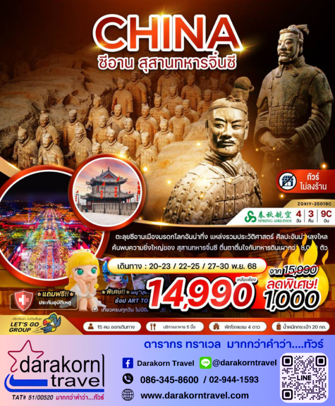 โปรไฟไหม้ ทัวร์จีน ซีอาน สุสานทหารจิ๋นซี 4วัน3คืน โปรแรง ลดราคา 1000 บาท จองด่วน Posted on October 28, 2025 by Sales Darakorn Travel 28 Oct ทัวร์จีน ซีอาน สุสานทหารจิ๋นซี 4วัน3คืน โปรแรง ลดราคา 1000 บาท จองด่วน ตะลุยซีอานเมืองมรดกโลก สุสานทหารจิ๋นซี ตื่นตาตื่นใจกับทหารดินเผากว่า 8000 ตัว วันเดินทาง 20-23/22-25/27-30พ.ย.68 จากราคา 15,990.- เหลือเพียง 14,990.- Facebook iconFacebookTwitter iconTwitterLINE iconLine Sales Darakorn Travel ทัวร์จีน ซินเจียงใต้ คัชการ์ 7วัน6คืน โปรแรง ลดราคา 2000 บาท จองด่วน ทัวร์จีน จางเจียเจี้ย อู่หลิงหยวน 6วัน5คืน โปรแรง ลดราคาสูงสุด 9000 บาท จองด่วน