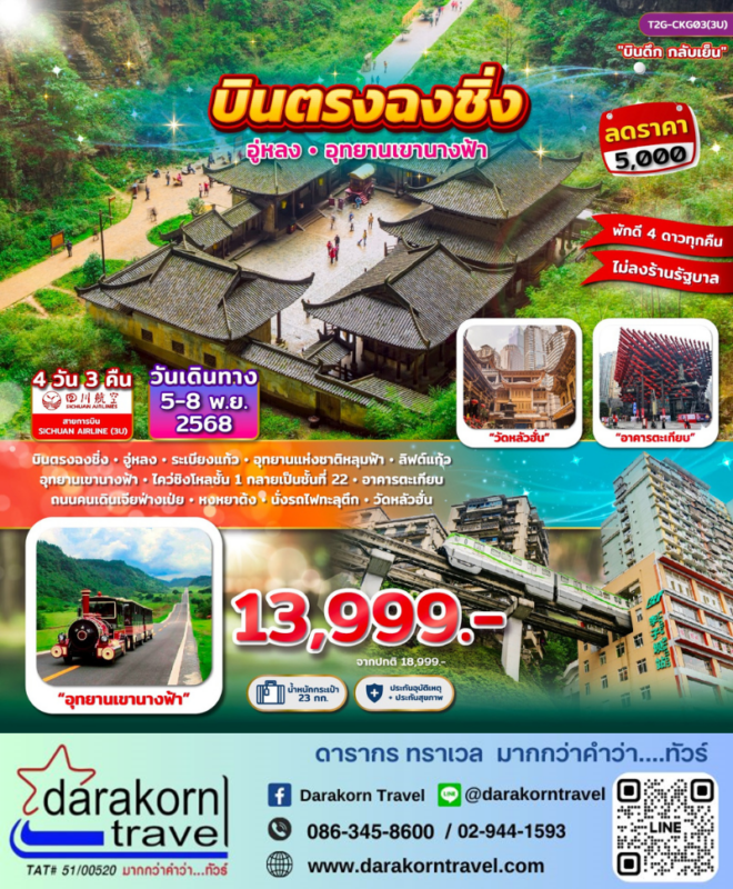 โปรไฟไหม้ ทัวร์จีน บินตรงฉงชิ่ง อู่หลง อุทยานเขานางฟ้า 4วัน3คืน โปรแรง ลดราคาสูงสุด 5000 บาท จองด่วน Posted on October 30, 2025 by Sales Darakorn Travel 30 Oct ทัวร์จีน บินตรงฉงชิ่ง อู่หลง อุทยานเขานางฟ้า 4วัน3คืน โปรแรง ลดราคาสูงสุด 5000 บาท จองด่วน อู่หลง ระเบียงแก้ว อุทยานแห่งชาติหลุมฟ้า นั่งรถไฟทะลุตึก วัดหลินฮั่น วันเดินทาง 05 – 08 พ.ย. 68 จากราคา 18,999.- เหลือเพียง 13,999.- Facebook iconFacebookTwitter iconTwitterLINE iconLine Sales Darakorn Travel ทัวร์จีน คุนหมิง ต้าลี่ ลี่เจียง แชงกรีล่า ภูเขาหิมะมังกรหยก 6วัน5คืน โปรแรง ลดราคาสูงสุด 5000 บาท จองด่วน2ที่สุดท้าย ทัวร์จีน จางเจียเจี้ย + ฉงชิ่ง 6วัน5คืน โปรแรง ลดราคาสูงสุด 11000 บาท จองด่วน