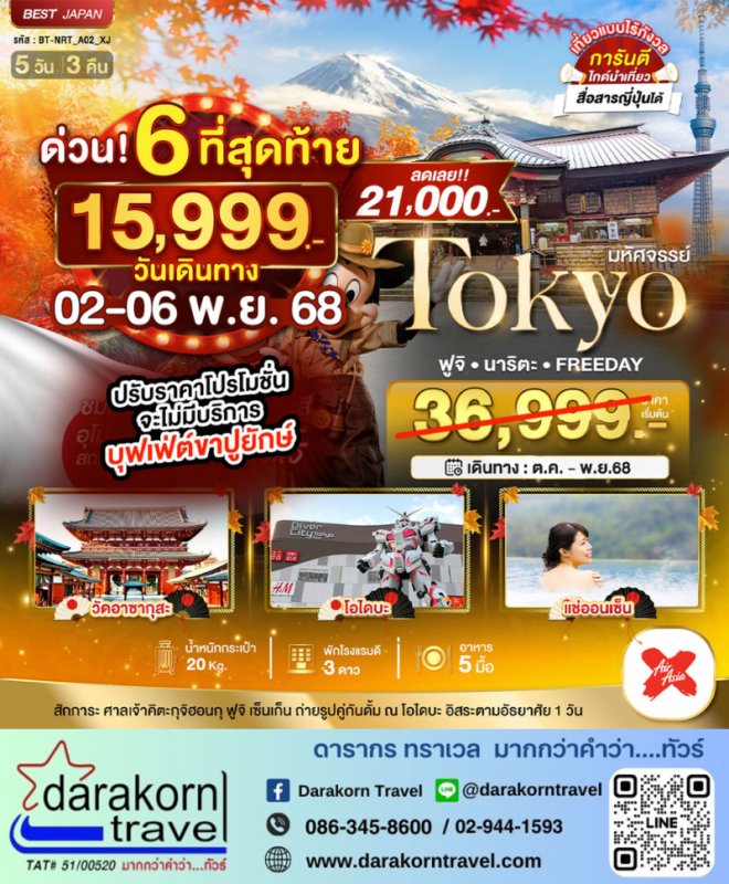 โปรไฟไหม้ ทัวร์ญี่ปุ่น โตเกียว ฟูจิ ฟรีเดย์ 5วัน3คืน โปรแรง ลดราคา 21000 บาท จองด่วน 6 ที่สุดท้าย Posted on October 31, 2025 by Sales Darakorn Travel 31 Oct ทัวร์ญี่ปุ่น โตเกียว ฟูจิ ฟรีเดย์ 5วัน3คืน โปรแรง ลดราคา 21000 บาท จองด่วน 6 ที่สุดท้าย วัดอาซากุสะ ศาลเจ้าคิตะกุจิฮอนกุ แช่ออนเซ็น ห้างโอไดบะกันดั้ม วันเดินทาง 02 – 06 พ.ย. 68 จากราคา 36,999.- เหลือเพียง 15,999.- Facebook iconFacebookTwitter iconTwitterLINE iconLine Sales Darakorn Travel ทัวร์ญี่ปุ่น โตเกียว 5วัน3คืน โปรแรง ลดราคา 7000 บาท จองด่วน 5 ที่สุดท้าย