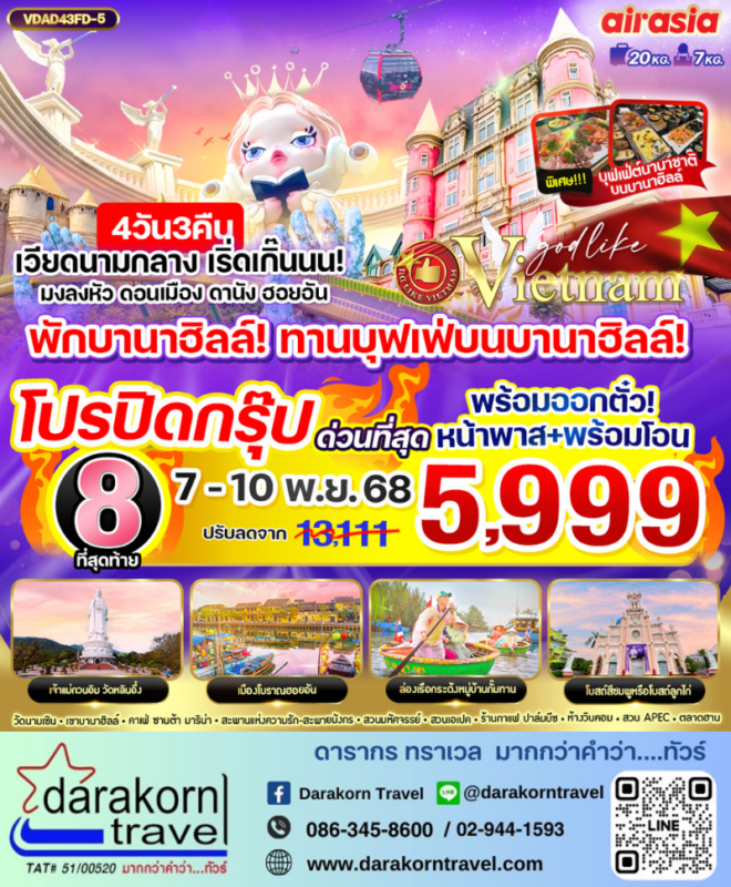 โปรไฟไหม้ ทัวร์เวียดนาม พักบานาฮิลล์ 4วัน3คืน โปรแรง ลดราคาสูงสุด 7000 บาท จองด่วน Posted on November 5, 2025November 5, 2025 by Sales Darakorn Travel 05 Nov ทัวร์เวียดนาม พักบานาฮิลล์ 4วัน3คืน โปรแรง ลดราคาสูงสุด 7000 บาท จองด่วน วันเดินทาง 07- 10 พ.ย. 68 จากราคา 13,111.- เหลือเพียง 5,999- Facebook iconFacebookTwitter iconTwitterLINE iconLine Sales Darakorn Travel ทัวร์ฮ่อกง ขอพร วัดดัง ช้อปปิ้งจุใจ 4วัน3คืน โปรแรง ลดราคาสูงสุด 3000 บาท จองด่วน ทัวร์เวียดนาม พักบานาฮิลล์ 4วัน3คืน โปรแรง ลดราคาสูงสุด 7000 บาท จองด่วน 8 ที่สุดท้าย