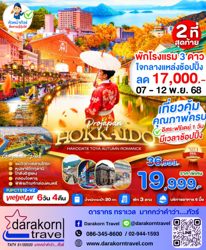 โปรไฟไหม้ ทัวร์ญี่ปุ่น ฮอกไกโด โรแมนติก 6วัน5คืน โปรแรง ลดราคาสูงสุด 17000 บาท จองด่วน Posted on November 6, 2025November 6, 2025 by Sales Darakorn Travel 06 Nov ทัวร์ญี่ปุ่น ฮอกไกโด โรแมนติก 6วัน5คืน โปรแรง ลดราคาสูงสุด 17000 บาท จองด่วน ทะเลสาบ หุบเขาจิโกกุดานิ คลองโอตารุ โกดังอิฐแดง วันเดินทาง 07-12 พ.ย. 68 จากราคา 36,999.- เหลือเพียง 19,999.- Facebook iconFacebookTwitter iconTwitterLINE iconLine Sales Darakorn Travel ทัวร์ญี่ปุ่น โตเกียว ฟูจิ ออทัม อินเลิฟ 5วัน3คืน โปรแรง ลดราคาสูงสุด 8000 บาท จองด่วน ทัวร์ญี่ปุ่น โอซาก้า อุโมงค์เมเปิ้ล 6วัน4คืน โปรแรง ลดราคาสูงสุด 7000 บาท จองด่วน