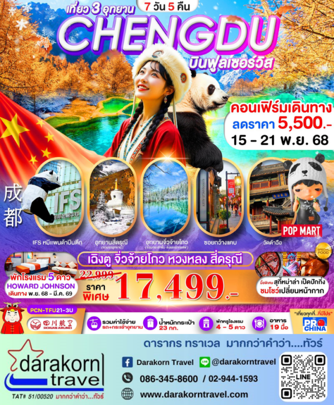 โปรไฟไหม้ ทัวร์จีน เฉิงตู บินฟลูเซอร์วิส 7วัน5คืน โปรแรง ลดราคา 5500 บาท จองด่วน Posted on November 13, 2025 by Sales Darakorn Travel 13 Nov ทัวร์จีน เฉิงตู บินฟลูเซอร์วิส 7วัน5คืน โปรแรง ลดราคา 5500 บาท จองด่วน อุทยานจิ่วจ้ายโกว อุทยานสี่ดรุณี ซอยกว้างแคบ วัดต้าฉือ วันเดินทาง 15 – 21 พ.ย. 2568 จากราคา 22,999.- เหลือเพียง 17,499.- Facebook iconFacebookTwitter iconTwitterLINE iconLine Sales Darakorn Travel ทัวร์จีน เฉิงตู สี่ดรุณี จิ่วจ้ายโกว 6วัน5คืน โปรแรง ลดราคา 5000 บาท จองด่วน 2 ที่สุดท้าย