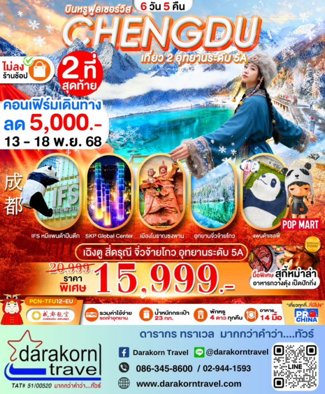 โปรไฟไหม้ ทัวร์จีน เฉิงตู สี่ดรุณี จิ่วจ้ายโกว 6วัน5คืน โปรแรง ลดราคา 5000 บาท จองด่วน 2 ที่สุดท้าย Posted on November 13, 2025 by Sales Darakorn Travel 13 Nov ทัวร์จีน เฉิงตู สี่ดรุณี จิ่วจ้ายโกว 6วัน5คืน โปรแรง ลดราคา 5000 บาท จองด่วน 2 ที่สุดท้าย อุทยานจิ่วจ้ายโกว แพนด้าเซลฟี่ เมืองโบราณซงพาน SKP Global Center วันเดินทาง 13-18 พ.ย. 2568 จากราคา 20,999.- เหลือเพียง 15,999.- Facebook iconFacebookTwitter iconTwitterLINE iconLine Sales Darakorn Travel ทัวร์จีน เที่ยวมหานครเซี่ยงไฮ้ 5วัน3คืน โปรแรง ลดราคา 2000 บาท จองด่วน ทัวร์จีน เฉิงตู บินฟลูเซอร์วิส 7วัน5คืน โปรแรง ลดราคา 5500 บาท จองด่วน