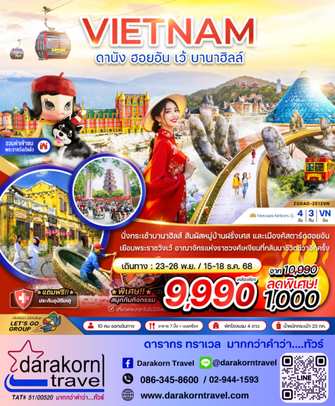 โปรไฟไหม้ ทัวร์เวียดนาม ดานัง ฮอยอัน เว้ บานาฮิลล์ 4วัน3คืน โปรแรง ลดราคา 1000 บาท จองด่วน Posted on November 14, 2025November 14, 2025 by Sales Darakorn Travel 14 Nov ทัวร์เวียดนาม ดานัง ฮอยอัน เว้ บานาฮิลล์ 4วัน3คืน โปรแรง ลดราคา 1000 บาท จองด่วน นั่งกระเช้าบานาฮิลล์ สัมผัสหมู่บ้านฝรั่งเศส เยือนพระราชวังเว้ เมืองคัสตาร์ดฮอยอัน วันเดินทาง23-26พ.ย./15-18ธ.ค. 2568 จากราคา 10,990.- เหลือเพียง 9,990.- Facebook iconFacebookTwitter iconTwitterLINE iconLine Sales Darakorn Travel ทัวร์เวียดนาม ฮานอย นิงห์บิงห์ ฮาลอง ตามด๋าว 5วัน4คืน โปรแรง ลดราคา 2000 บาท จองด่วน ทัวร์เวียดนาม โตเกียว ฟูจิ ฮาโกเน่ 5วัน3คืน โปรแรง ลดราคา 11000 บาท จองด่วน 3 ที่สุดท้าย