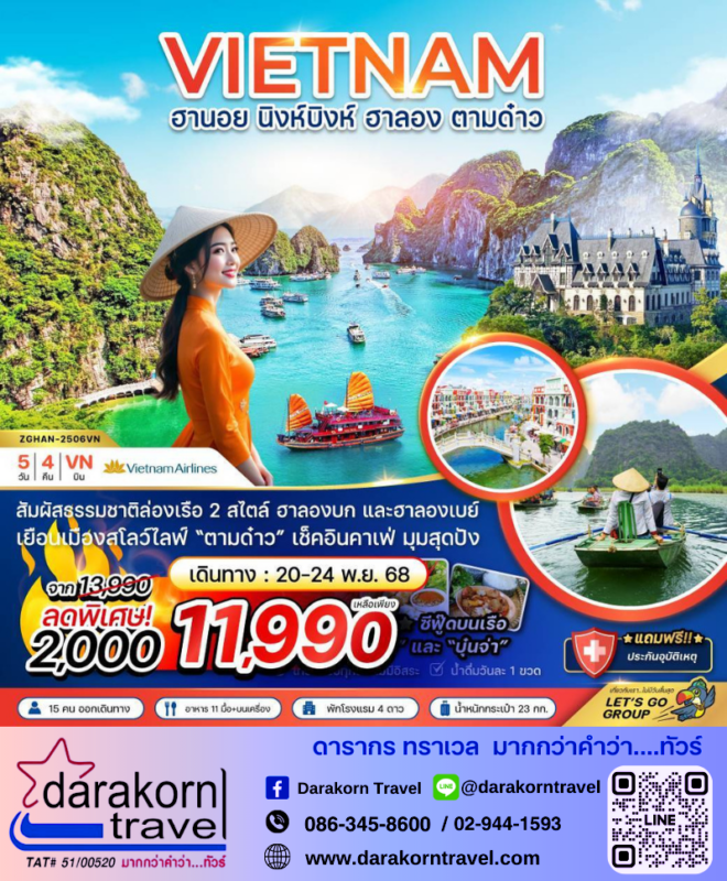 โปรไฟไหม้ ทัวร์เวียดนาม ฮานอย นิงห์บิงห์ ฮาลอง ตามด๋าว 5วัน4คืน โปรแรง ลดราคา 2000 บาท จองด่วน Posted on November 14, 2025 by Sales Darakorn Travel 14 Nov ทัวร์เวียดนาม ฮานอย นิงห์บิงห์ ฮาลอง ตามด๋าว 5วัน4คืน โปรแรง ลดราคา 2000 บาท จองด่วน ล่องเรือ 2 สไตล์ ฮาลองบก และฮาลองเบย์ เยือนเมืองสโลว์ไลฟ์ ตามด๋าว ล่องเรือกระด้ง พักเมืองโบราณฮอยอัน วันเดินทาง 20 – 24 พ.ย. 2568 จากราคา 13,990.- เหลือเพียง 11,990.- Facebook iconFacebookTwitter iconTwitterLINE iconLine Sales Darakorn Travel ทัวร์เวียดนาม ดานัง ฮออยอัน บานาฮิลล์ 4วัน3คืน โปรแรง ลดราคา 2000 บาท จองด่วน ทัวร์เวียดนาม ดานัง ฮอยอัน เว้ บานาฮิลล์ 4วัน3คืน โปรแรง ลดราคา 1000 บาท จองด่วน