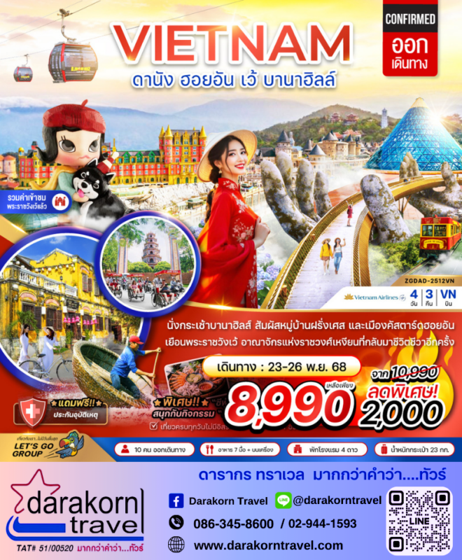 โปรไฟไหม้ ทัวร์เวียดนาม ดานัง ฮอยอัน เว้ บานาฮิลล์ 4วัน3คืน โปรแรง ลดราคา 2000 บาท จองด่วน Posted on November 17, 2025 by Sales Darakorn Travel 17 Nov ทัวร์เวียดนาม ดานัง ฮอยอัน เว้ บานาฮิลล์ 4วัน3คืน โปรแรง ลดราคา 2000 บาท จองด่วน นั่งกระเช้าบานาฮิลล์ สัมผัสหมู่บ้านฝรั่งเศส เยือนพระราชวังเว้ วันเดินทาง 23-26 พ.ย.68 จากราคา 10,990.- เหลือเพียง 8,990.- Facebook iconFacebookTwitter iconTwitterLINE iconLine Sales Darakorn Travel ทัวร์ญี่ปุ่น โอซาก้า โตเกียว 6วัน4คืน โปรแรง ลดราคา 4000 บาท จองด่วน