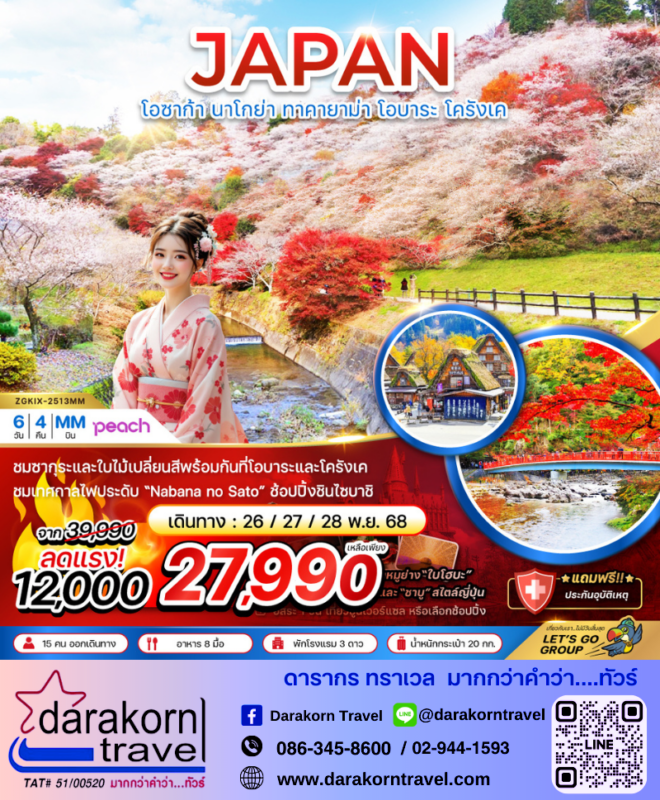 โปรไฟไหม้ ทัวร์ญี่ปุ่น โอซาก้า นาโกย่า โอบาระ โครังเค 6วัน4คืน โปรแรง ลดราคา 12000 บาท จองด่วน Posted on November 21, 2025 by Sales Darakorn Travel 21 Nov ทัวร์ญี่ปุ่น โอซาก้า นาโกย่า โอบาระ โครังเค 6วัน4คืน โปรแรง ลดราคา 12000 บาท จองด่วน ชมซากุระ + ใบไม้เปลี่ยนสี พร้อมกันที่โอบาระ และโครังเค ชมเทศกาลประดับไฟ นาบานะ ซาโตะ ช้อปปิ้งชินไซบาชิ วันเดินทาง 26/27/28 พ.ย.68 จากราคา 39,990.- เหลือเพียง 27,990.- Facebook iconFacebookTwitter iconTwitterLINE iconLine Sales Darakorn Travel ทัวร์จีน SPECIAL CHENGDU 6วัน5คืน โปรแรง ลดราคา 6000 บาท จองด่วน ทัวร์ไต้หวัน เหมาลำไถจง ไทเป เคาท์ดาวน์ 5วัน4คืน โปรแรง ลดราคา 4000 บาท จองด่วน