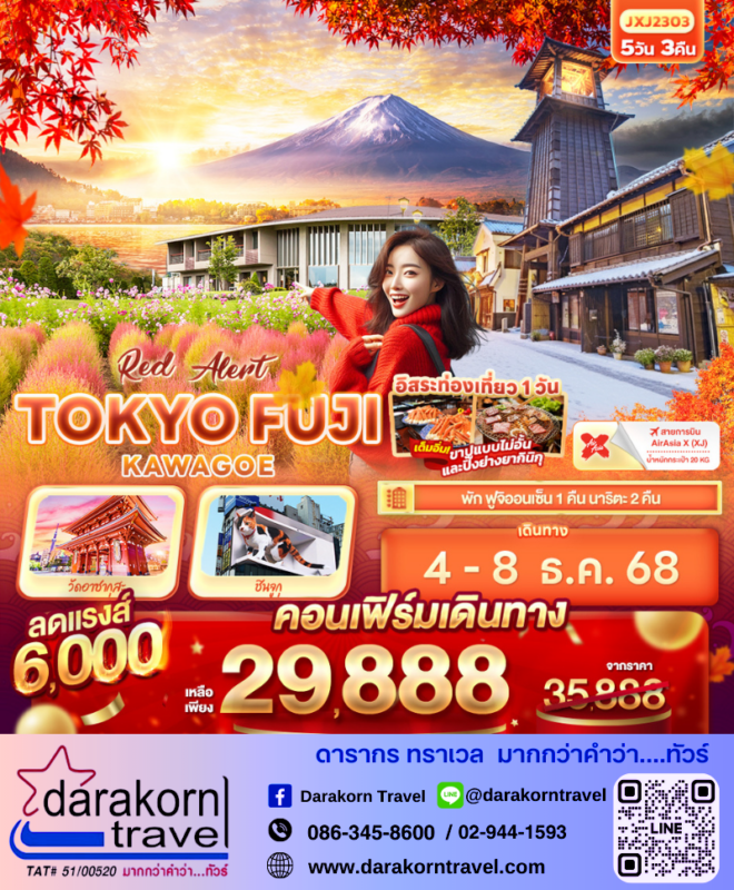 โปรไฟไหม้ ทัวร์ญี่ปุ่น โตเกียว ฟูจิ คาวาโกะ 5วัน3คืน โปรแรง ลดราคา 6000 บาท จองด่วน Posted on November 27, 2025 by Sales Darakorn Travel 27 Nov ทัวร์ญี่ปุ่น โตเกียว ฟูจิ คาวาโกะ 5วัน3คืน โปรแรง ลดราคา 6000 บาท จองด่วน วัดอาซากุสะ ชินจูกุ ออนเซ็น+บุฟขาปู+ปิ้งย่างยากินิกุ วันเดินทาง 04 – 08 ธ.ค.68 จากราคา 35,888.- เหลือเพียง 29,888. Facebook iconFacebookTwitter iconTwitterLINE iconLine Sales Darakorn Travel ทัวร์ญี่ปุ่น โตเกียว ฟูจิ 5วัน3คืน โปรแรง ลดราคา 7000 บาท จองด่วน ทัวร์จีน ฉันจะไป…เฉิงตู สี่ดรุณี ภูเขาหิมะวาวู 5วัน4คืน โปรแรง ลดราคา 4000 บาท จองด่วน