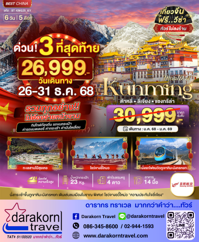 โปรไฟไหม้ ทัวร์จีน คุนหมิง ต้าหลี่ ลี่เจี่ยง แชงกรีล่า 6วัน5คืน โปรแรง ลดราคา 4,000 บาท จองด่วน 3 ที่สุดท้าย Posted on December 17, 2025 by Sales Darakorn Travel 17 Dec ทัวร์จีน คุนหมิง ต้าหลี่ ลี่เจี่ยง แชงกรีล่า 6วัน5คืน โปรแรง ลดราคา 4,000 บาท จองด่วน 3 ที่สุดท้าย ชมโชว์จางอี้โหมว ทะเลสาบไป๋สุยเหอ นั่งรถไฟชมภูเขาหิมะมังกรหยก วันเดินทาง 26 – 31 ธ.ค.68 จากราคา 30,999.- เหลือเพียง 26,999. Facebook iconFacebookTwitter iconTwitterLINE iconLine Sales Darakorn Travel ทัวร์จีน คุนหมิง ต้าหลี่ ลี่เจี่ยง แชงกรีล่า 6วัน5คืน โปรแรง ลดราคา 5,099 บาท จองด่วน 4 ที่สุดท้าย ทัวร์จีน มหานครเซี่ยงไฮ้ 5วัน3คืน โปรแรง ลดราคา 4,000 บาท จองด่วน