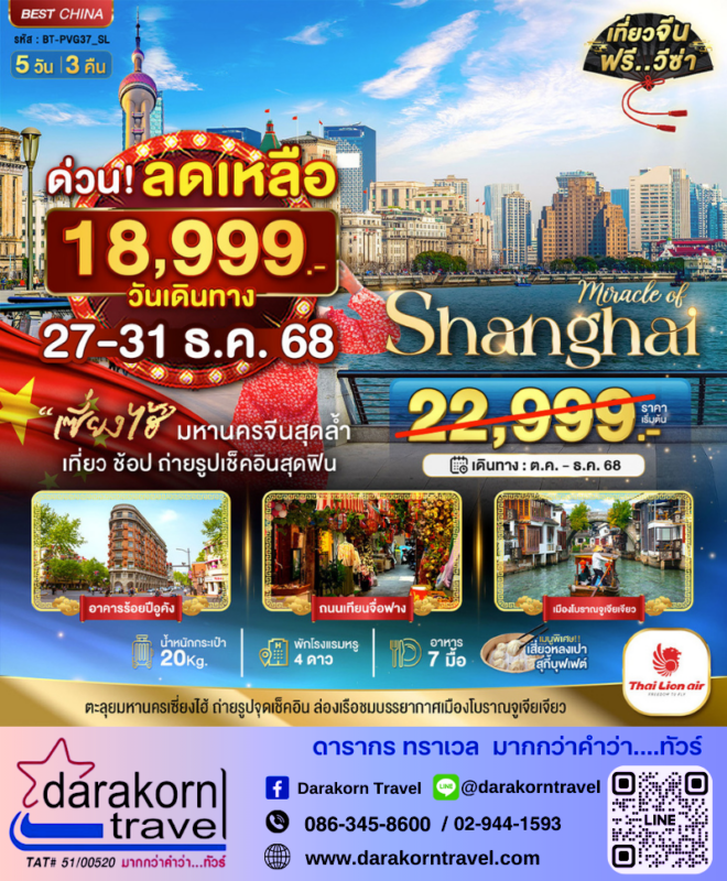 โปรไฟไหม้ ทัวร์จีน มหานครเซี่ยงไฮ้ 5วัน3คืน โปรแรง ลดราคา 4,000 บาท จองด่วน Posted on December 17, 2025 by Sales Darakorn Travel 17 Dec ทัวร์จีน มหานครเซี่ยงไฮ้ 5วัน3คืน โปรแรง ลดราคา 4,000 บาท จองด่วน อาคารร้อยปีอูคัง ถนนเทียนจื่อฟาง เมืองโบราณจูเจียเจี่ยว วันเดินทาง 27 – 31 ธ.ค.68 จากราคา 22,999.- เหลือเพียง 18,999. Facebook iconFacebookTwitter iconTwitterLINE iconLine Sales Darakorn Travel ทัวร์จีน คุนหมิง ต้าหลี่ ลี่เจี่ยง แชงกรีล่า 6วัน5คืน โปรแรง ลดราคา 4,000 บาท จองด่วน 3 ที่สุดท้าย ทัวร์จีน Find Your Bliss Taiwan 4วัน3คืน โปรแรง ลดราคา 3,000 บาท จองด่วน