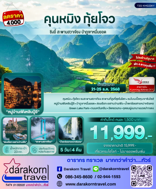 โปรไฟไหม้ ทัวร์จีน คุนหมิง กุ้ยโจว 6วัน4คืน โปรแรง ลดราคา 4,000 บาท จองด่วน Posted on December 18, 2025 by Sales Darakorn Travel 18 Dec ทัวร์จีน คุนหมิง กุ้ยโจว 6วัน4คืน โปรแรง ลดราคา 4,000 บาท จองด่วน คุนหมิง กุ้ยโจว ล่องเรือทะเลสาบว่านเฟิง วัดหยวนทง วันเดินทาง 21-25 ธ.ค.68 จากราคา 15,999.- เหลือเพียง 11,999. Facebook iconFacebookTwitter iconTwitterLINE iconLine Sales Darakorn Travel ทัวร์ญี่ปุ่น TOKYO Fuji Snow 6วัน4คืน โปรแรง ลดราคา 14,000 บาท จองด่วน 4 ที่สุดท้าย ทัวร์จีน ซีอาน ลั่วหยาง 6วัน4คืน โปรแรง ลดราคา 6,000 บาท จองด่วน