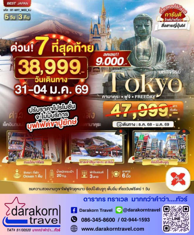 โปรไฟไหม้ ทัวร์จีน คามาคุระ ฟูจิ ฟรีเดย์ 5วัน3คืน โปรแรง ลดราคา 9,000 บาท จองด่วน 7 ที่สุดท้าย Posted on December 23, 2025 by Sales Darakorn Travel 23 Dec ทัวร์จีน คามาคุระ ฟูจิ ฟรีเดย์ 5วัน3คืน โปรแรง ลดราคา 9,000 บาท จองด่วน 7 ที่สุดท้าย ถนนโคมาจิโดริ ศาลเจ้าสีรุงะโอะกะ ฮะจิมัง ชมความงามของภูเขาไฟฟูจิ ช้อปปิ้งชินจูกุ วันเดินทาง 30 ธ.ค. – 04 ม.ค.69 จากราคา 47,999.- เหลือเพียง 38,999. Facebook iconFacebookTwitter iconTwitterLINE iconLine Sales Darakorn Travel ทัวร์จีน คาวาโกเอะ ฟูจิ โอไดบะ 5วัน3คืน โปรแรง ลดราคา 9,000 บาท จองด่วน ทัวร์จีน คุนหมิง ภูเขาหิมะเจี้ยวจื่อ เขาซีซาน 4วัน3คืน โปรแรง ลดราคา 2,000 บาท จองด่วน