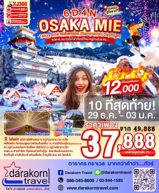 โปรไฟไหม้ ทัวร์ญี่ปุ่น โอซาก้า มิเอะ 6วัน4คืน โปรแรง ลดราคา 12,000 บาท จองด่วน 10 ที่สุดท้าย Posted on December 25, 2025 by Sales Darakorn Travel 25 Dec ทัวร์ญี่ปุ่น โอซาก้า มิเอะ 6วัน4คืน โปรแรง ลดราคา 12,000 บาท จองด่วน 10 ที่สุดท้าย อลังการไฟล้านดวง ณ หมู่บ้านนาบานะ โนะ ซาโตะ ลานสกีเมืองกุโจ หมู่บ้านชิราคาวาโกะ ช้อปปิ้งจุใจย่านชินไซบาชิ วันเดินทาง 29 ธ.ค. – 03 ม.ค. 69 จากราคา 49,888.- เหลือเพียง 37,888 Facebook iconFacebookTwitter iconTwitterLINE iconLine Sales Darakorn Travel ทัวร์ญี่ปุ่น โตเกียว ฟูจิ 5วัน3คืน โปรแรง ลดราคา 10,000 บาท จองด่วน 7 ที่สุดท้าย