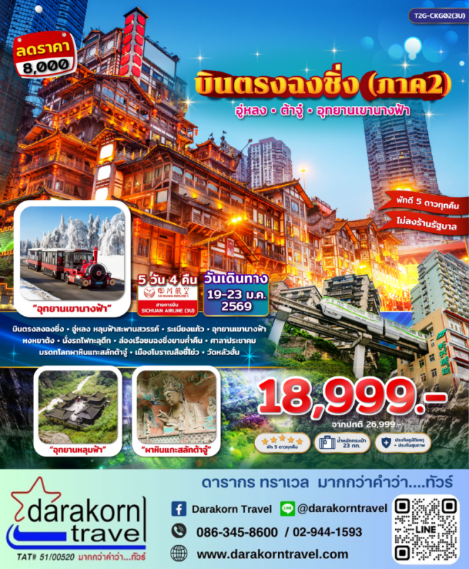 โปรไฟไหม้ ทัวร์จีน บินตรง ฉงชิ่ง ภาค2 5วัน4คืน โปรแรง ลดราคา 8,000 บาท จองด่วน Posted on January 12, 2026 by Sales Darakorn Travel 12 Jan ทัวร์จีน บินตรง ฉงชิ่ง ภาค2 5วัน4คืน โปรแรง ลดราคา 8,000 บาท จองด่วน อู่หลง หลุมฟ้าสะพานสวรรค์ ระเบียงแก้ว อุทยานเขานางฟ้า ศาลาประชาคม วันเดินทาง 19-23 ม.ค. 69 จากราคา 26,999.- เหลือเพียง 18,999.- Facebook iconFacebookTwitter iconTwitterLINE iconLine Sales Darakorn Travel ทัวร์จีน Miss U Kunming 5วัน4คืน โปรแรง ลดราคา 4,000 บาท จองด่วน 5 ที่สุดท้าย ทัวร์จีน บินตรง ฉงชิ่ง อุทยานเขานางฟ้า 5วัน4คืน โปรแรง ลดราคา 6,000 บาท จองด่วน