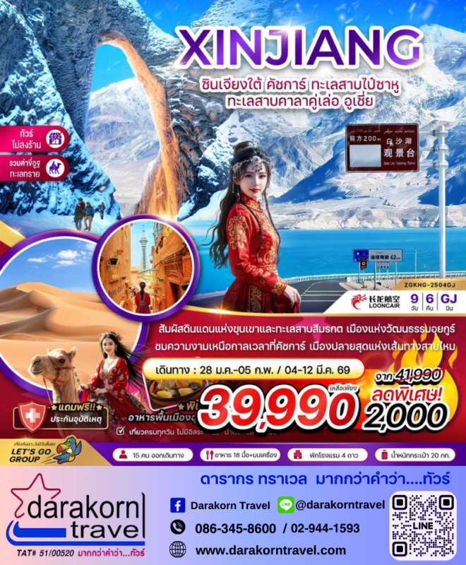โปรไฟไหม้ ทัวร์จีน ซินเจียงใต้ คัชการ์ อูเชี่ย 9วัน6คืน โปรแรง ลดราคา 2,000 บาท จองด่วน Posted on January 14, 2026 by Sales Darakorn Travel 14 Jan ทัวร์จีน ซินเจียงใต้ คัชการ์ อูเชี่ย 9วัน6คืน โปรแรง ลดราคา 2,000 บาท จองด่วน สัมผัสดินแดนแห่งขุนเขาและทะเลสีมรกต วัฒนธรรมอุยกูร์ ชมความเหนือกาลเวลาที่คัชการ์ เมืองปลายสุดแห่งเส้นทางสายไหม วันเดินทาง 28 ม.ค. – 05 ก.พ.69 04 -12 มี.ค. 69 จากราคา 41,990.- เหลือเพียง 39,990.- Facebook iconFacebookTwitter iconTwitterLINE iconLine Sales Darakorn Travel ทัวร์ญี่ปุ่น โอซาห้า เกียวโต อาราชิย่ามา ชิราคาวาโกะ 5วัน3คืน โปรแรง ลดราคา 4,000 บาท จองด่วน