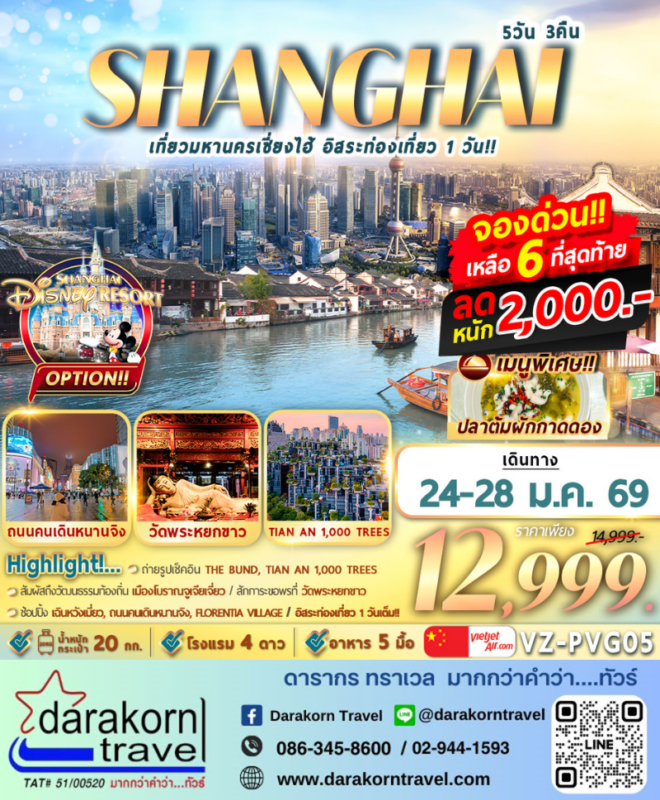 โปรไฟไหม้ ทัวร์จีน มหานครเซี่ยงไฮ้ อิสระ1วัน 5วัน3คืน โปรแรง ลดราคา 2,000 บาท จองด่วน เหลือ6ที่สุดท้าย Posted on January 14, 2026 by Sales Darakorn Travel 14 Jan ทัวร์จีน มหานครเซี่ยงไฮ้ อิสระ1วัน 5วัน3คืน โปรแรง ลดราคา 2,000 บาท จองด่วน เหลือ6ที่สุดท้าย เช็คอิน THE BUND TIAN AN 1000 TREES วัดพระหยกขาว เมืองโบราณจูเจียเจี่ยว ถนนคนเดินหนานจิง วันเดินทาง 24-28 ม.ค. 69 จากราคา 14,999.- เหลือเพียง 12,999.- Facebook iconFacebookTwitter iconTwitterLINE iconLine Sales Darakorn Travel ทัวร์เวียดนาม ฟูก๊วก สวนน้ำ สวนสนุก 3วัน2คืน โปรแรง ลดราคา 3,000 บาท จองด่วน ทัวร์ญี่ปุ่น ฮอกไกโด หิมะ ขวาซ้ายขวา 6วัน4คืน โปรแรง ลดราคา 9,000 บาท จองด่วน