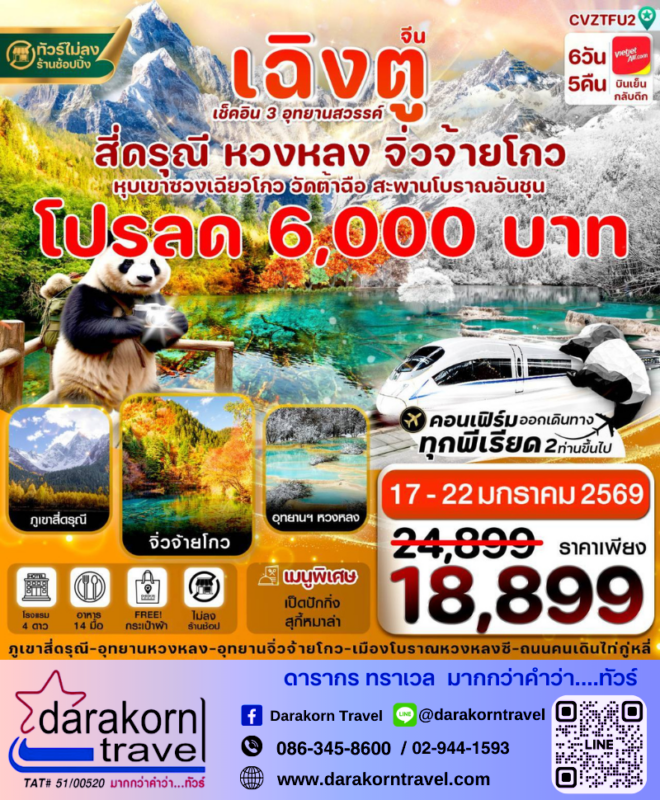 โปรไฟไหม้ ทัวร์จีน เฉิงตู เช็คอิน3อุทยานสวรรค์ 6วัน5คืน โปรแรง ลดราคา 6,000 บาท จองด่วน Posted on January 15, 2026 by Sales Darakorn Travel 15 Jan ทัวร์จีน เฉิงตู เช็คอิน3อุทยานสวรรค์ 6วัน5คืน โปรแรง ลดราคา 6,000 บาท จองด่วน จิ่วจ้ายโกว ภูเขาสี่ดรุณี อุทยานหวงหลง ถนนคนเดินไท่กู่หลี่ วันเดินทาง 17-22 ม.ค. 69 จากราคา 24,899.- เหลือเพียง 18,899.- Facebook iconFacebookTwitter iconTwitterLINE iconLine Sales Darakorn Travel ทัวร์จีน จิ่วจ้ายโกว ภูเขาสี่ดรุณี 6วัน5คืน โปรแรง ลดราคา 6,000 บาท จองด่วน ทัวร์จีน เฉิงตู เช็คอิน ฟิวยุโรป ที่เสฉวน 6วัน5คืน โปรแรง ลดราคา 3,000 บาท จองด่วน
