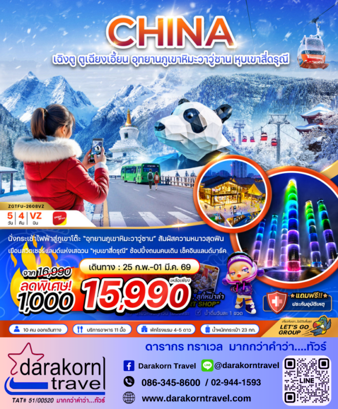 โปรไฟไหม้ ทัวร์จีน เฉิงตู ตูเจียงเอี้ยน อุทยานภูเขาหิมะวาวู่ซาน หุบเขาสี่ดรุณี 5วัน4คืน โปรแรง ลดราคา 1,000 บาท จองด่วน Posted on January 16, 2026 by Sales Darakorn Travel 16 Jan ทัวร์จีน เฉิงตู ตูเจียงเอี้ยน อุทยานภูเขาหิมะวาวู่ซาน หุบเขาสี่ดรุณี 5วัน4คืน โปรแรง ลดราคา 1,000 บาท จองด่วน นั่งรถไฟฟ้าสู่ภูเขาโต๊ะ อุทยานภูเขาหิมะวาวู่ซาน หุบเขาสี่ดรุณี ช้อปปิ้งถนนคนเดิน เช็คอินแลนด์มาร์ค วันเดินทาง 25 ก.พ. – 01 มี.ค. 69 จากราคา 16,990.- เหลือเพียง 15,990.- Facebook iconFacebookTwitter iconTwitterLINE iconLine Sales Darakorn Travel ทัวร์ญี่ปุ่น Very Cool Winter Hokkaido 5วัน3คืน โปรแรง ลดราคา 10,000 บาท จองด่วน ทัวร์จีน ชิงเต่า เสน่ห์ยุโรปแห่งเอเชีย 5วัน3คืน โปรแรง ลดราคา 4,000 บาท จองด่วน