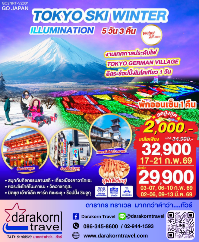 โปรไฟไหม้ ทัวร์ญี่ปุ่น Tokyo Ski Winter 5วัน3คืน โปรแรง ลดราคา 2,000 บาท จองด่วน Posted on January 22, 2026 by Sales Darakorn Travel 22 Jan ทัวร์ญี่ปุ่น Tokyo Ski Winter 5วัน3คืน โปรแรง ลดราคา 2,000 บาท จองด่วน วัดอาซากุสะ หอระฆังโทคิโนะคาเนะ สนุกกับลานสกี ช้อปปิ้งชินจูกุ วันเดินทาง 17 – 21ก.พ. 69 03-07/06-10 ก.พ.69 02-06/09-13 มี.ค.69 จากราคา 34,900.- เหลือเพียง 32,900.- Facebook iconFacebookTwitter iconTwitterLINE iconLine Sales Darakorn Travel ทัวร์ญี่ปุ่น Hakuba Iwatake Shirakawago 6วัน4คืน โปรแรง ลดราคา 2,000 บาท จองด่วน ทัวร์ญี่ปุ่น บินตรง SENDAI AOMORI 6วัน4คืน โปรแรง ลดราคา 2,000 บาท จองด่วน