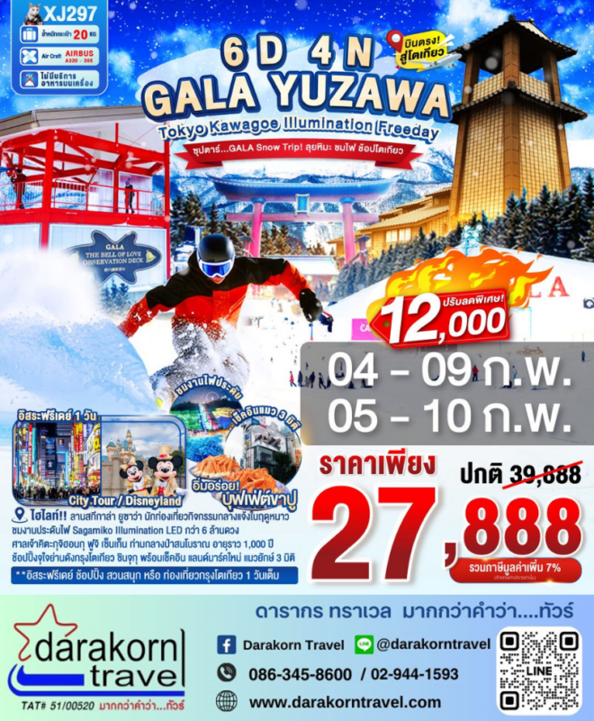 โปรไฟไหม้ ทัวร์ญี่ปุ่น GALA YUZAWA 6วัน4คืน โปรแรง ลดราคา 12,000 บาท จองด่วน Posted on January 26, 2026 by Sales Darakorn Travel 26 Jan ทัวร์ญี่ปุ่น GALA YUZAWA 6วัน4คืน โปรแรง ลดราคา 12,000 บาท จองด่วน ลานสกีกาล่า ยูซาว่า งานประดับไฟ Sagamiko IIIumination LED ศาลเจ้าคิตะกุ ช้อปปิ้งจุใจย่านชินจูกุ วันเดินทาง 04-09/05-10 ก.พ. 69 จากราคา 39,888.- เหลือเพียง 27,888.- Facebook iconFacebookTwitter iconTwitterLINE iconLine Sales Darakorn Travel ทัวร์ญี่ปุ่น โอซาก้า เกียวโต เสน่ห์หิมะโรแมนติกแห่งญี่ป่น 6วัน4คืน โปรแรง ลดราคา 11,000 บาท จองด่วน ทัวร์ญี่ปุ่น นาโกย่า บิวะโกะ 6วัน4คืน โปรแรง ลดราคา 18,000 บาท จองด่วน