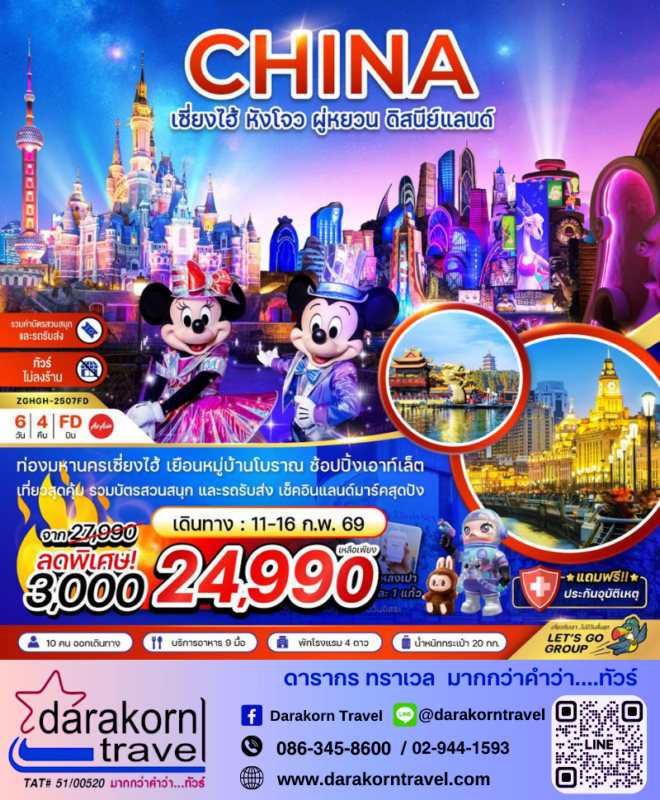 โปรไฟไหม้ ทัวร์จีน เซี่ยงไฮ้ หังโจว ผู้หยวน 6วัน5คืน โปรแรง ลดราคา 3,000 บาท จองด่วน Posted on January 30, 2026 by Sales Darakorn Travel 30 Jan ทัวร์จีน เซี่ยงไฮ้ หังโจว ผู้หยวน 6วัน5คืน โปรแรง ลดราคา 3,000 บาท จองด่วน ท่องมหานครเซี่ยงไฮ้ เยือนหมู่บ้านโบราณ รวมบัตรดินีย์แลนด์แล้ว วันเดินทาง 11- 16ก.พ.69 จากราคา 27,990.- เหลือเพียง 24,990.- Facebook iconFacebookTwitter iconTwitterLINE iconLine Sales Darakorn Travel ทัวร์จีน ชิงเต่า รื่อจ้าว หลินอี๋ 6วัน5คืน โปรแรง ลดราคา 4,000 บาท จองด่วน ทัวร์ญี่ปุ่น TOKYO ATAMI FUJI 5วัน3คืน โปรแรง ลดราคา 16,000 บาท จองด่วน