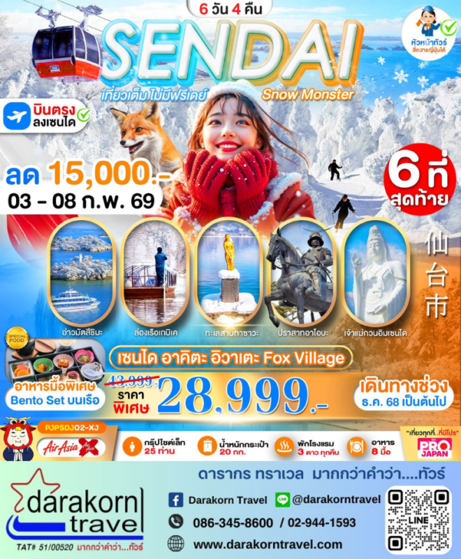 โปรไฟไหม้ ทัวร์ญี่ปุ่น เซนได สโนว์มอนเตอร์ 6วัน4คืน โปรแรง ลดราคา 15,000 บาท จองด่วน Posted on January 30, 2026 by Sales Darakorn Travel 30 Jan ทัวร์ญี่ปุ่น เซนได สโนว์มอนเตอร์ 6วัน4คืน โปรแรง ลดราคา 15,000 บาท จองด่วน ล่องเรือเกบิเค ทะเลสาบทาซาวะ ปราสาทอาโอบะ เจ้าแม่กวนอิมเซนได วันเดินทาง 03-08 ก.พ.69 จากราคา 43,999.- เหลือเพียง 28,999.- Facebook iconFacebookTwitter iconTwitterLINE iconLine Sales Darakorn Travel ทัวร์ญี่ปุ่น Osaka Takayama Sato Snow 6วัน4คืน โปรแรง ลดราคา 15,000 บาท จองด่วน ทัวร์ไต้หวัน เถาหยวน เจียอี้ อาลีซาน 5วัน4คืน โปรแรง ลดราคา 2,000 บาท จองด่วน