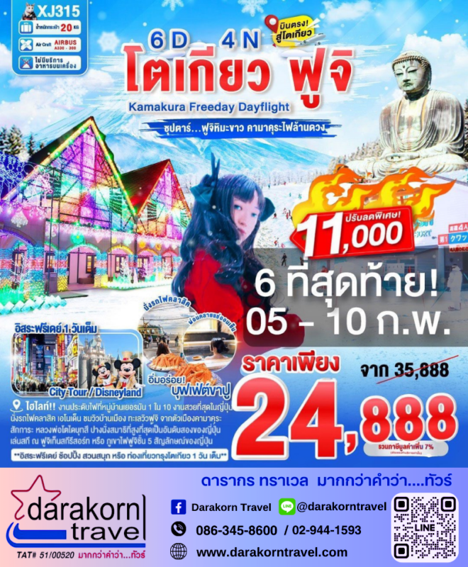 โปรไฟไหม้ ทัวร์ญี่ปุ่น TOKYO FUJI Kamakura 6วัน4คืน โปรแรง ลดราคา 11,000 บาท จองด่วน Posted on January 30, 2026 by Sales Darakorn Travel 30 Jan ทัวร์ญี่ปุ่น TOKYO FUJI Kamakura 6วัน4คืน โปรแรง ลดราคา 11,000 บาท จองด่วน ชมงานประดับไฟที่หมู่บ้านเยอรมัน นั่งรถไฟคลาสสิค เอโนเด็น หลวงพ่อโตไดบุทสึ เล่นสกี ณฟูจิเท็น วันเดินทาง 05-10 ก.พ.69 จากราคา 35,888.- เหลือเพียง 24,888.- Facebook iconFacebookTwitter iconTwitterLINE iconLine Sales Darakorn Travel ทัวร์ญี่ปุ่น TOKYO ATAMI FUJI 5วัน3คืน โปรแรง ลดราคา 16,000 บาท จองด่วน ทัวร์ญี่ปุ่น Osaka Takayama Sato Snow 6วัน4คืน โปรแรง ลดราคา 15,000 บาท จองด่วน