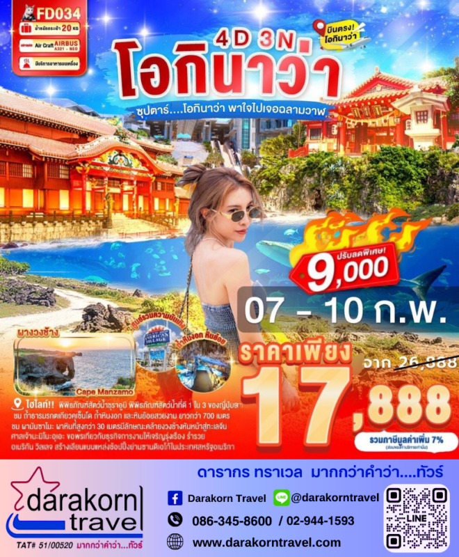 โปรไฟไหม้ ทัวร์ญี่ปุ่น โอกินาว่า พาใจไปเจอฉลามวาฬ 4วัน3 คืน โปรแรง ลดราคา 9,000 บาท จองด่วน Posted on February 2, 2026 by Sales Darakorn Travel 02 Feb ทัวร์ญี่ปุ่น โอกินาว่า พาใจไปเจอฉลามวาฬ 4วัน3 คืน โปรแรง ลดราคา 9,000 บาท จองด่วน ถ้ำธารมรกต ชมหินงิกหินย้อย ผามันซาโมะ ศาลเจ้านะมิโนะอุเอะ วันเดินทาง 07 – 10 ก.พ.69 จากราคา 26,888.- เหลือเพียง 17,888.- Facebook iconFacebookTwitter iconTwitterLINE iconLine Sales Darakorn Travel ทัวร์ญี่ปุ่น เซนได ออนเซน ฟุกุชิม่า 6วัน4คืน โปรแรง ลดราคา 8,000 บาท จองด่วน ทัวร์ญี่ปุ่น โอซาก้า เกียวโต นารา 4วัน3 คืน โปรแรง ลดราคา 4,000 บาท จองด่วน