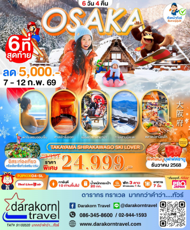 โปรไฟไหม้ ทัวร์ญี่ปุ่น โอซาก้า สกีวินเทอร์ 5วัน3 คืน โปรแรง ลดราคา 5,000 บาท จองด่วน Posted on February 5, 2026 by Sales Darakorn Travel 05 Feb ทัวร์ญี่ปุ่น โอซาก้า สกีวินเทอร์ 5วัน3 คืน โปรแรง ลดราคา 5,000 บาท จองด่วน เมืองเก่าทาคายาม่า ศาลเจ้าจิ้งจอก ทะเลสาบมิคะตะ ตลาดปลานิฮงไค พักโรงแรมออนเซ็น วันเดินทาง 07 – 12 ก.พ. 69 จากราคา 29,999.- เหลือเพียง 24,999.- Facebook iconFacebookTwitter iconTwitterLINE iconLine Sales Darakorn Travel ทัวร์ญี่ปุ่น โอซาก้า สกีวินเทอร์ 5วัน3 คืน โปรแรง ลดราคา 7,000 บาท จองด่วน ทัวร์ญี่ปุ่น โอซาก้า หิมะล่องเรือ ดูไฟ 6วัน4 คืน โปรแรง ลดราคา 9,920 บาท จองด่วน