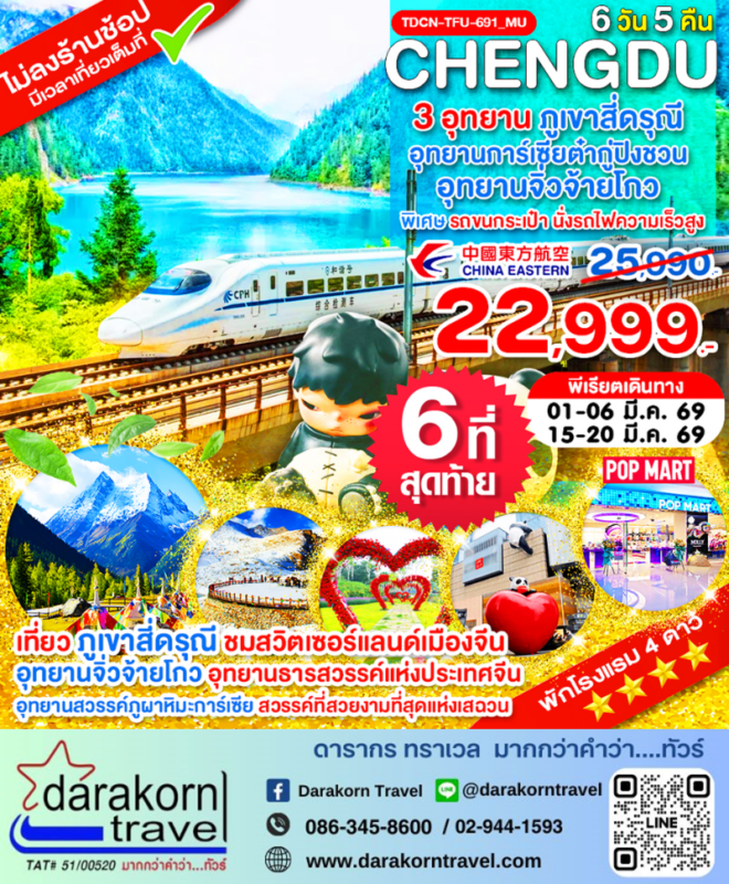 โปรไฟไหม้ ทัวร์จีน เฉิงตู 3อุทยาน 6วัน5 คืน โปรแรง ลดราคา 3,000 บาท จองด่วน เหลือ6ที่สุดท้าย Posted on February 9, 2026 by Sales Darakorn Travel 09 Feb ทัวร์จีน เฉิงตู 3อุทยาน 6วัน5 คืน โปรแรง ลดราคา 3,000 บาท จองด่วน เหลือ6ที่สุดท้าย อุทยานจิ่วจ้ายโกว อุทยานการ์เซียต๋ากู่ปิงชวน อุทยานภูเขาสี่ดรุณี ช้อปปิ้ง POP MART วันเดินทาง 01-06/15-20 มี.ค.69 จากราคา 25,990.- เหลือเพียง 22,999.- Facebook iconFacebookTwitter iconTwitterLINE iconLine Sales Darakorn Travel ทัวร์ญี่ปุ่น Est Hokkaido 6วัน4 คืน โปรแรง ลดราคา 10,000 บาท จองด่วน เหลือ10ที่สุดท้าย