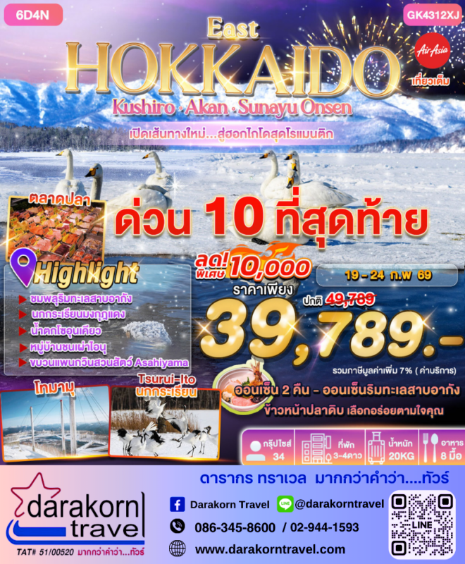 โปรไฟไหม้ ทัวร์ญี่ปุ่น Est Hokkaido 6วัน4 คืน โปรแรง ลดราคา 10,000 บาท จองด่วน เหลือ10ที่สุดท้าย Posted on February 9, 2026 by Sales Darakorn Travel 09 Feb ทัวร์ญี่ปุ่น Est Hokkaido 6วัน4 คืน โปรแรง ลดราคา 10,000 บาท จองด่วน เหลือ10ที่สุดท้าย ชมพลุริมทะเลสาบอากัง นกกระเรียนมงกุฎแดง น้ำตกโซฮุนเคียว หมู่บ้านชนเผ่าไอนุ ตลาดปลา วันเดินทาง 19-24 ก.พ.69 จากราคา 49,789.- เหลือเพียง 39,789.- Facebook iconFacebookTwitter iconTwitterLINE iconLine Sales Darakorn Travel ทัวร์ญี่ปุ่น FUJI Go Around 6วัน4 คืน โปรแรง ลดราคา 3,000 บาท จองด่วน เหลือ8ที่สุดท้าย ทัวร์จีน เฉิงตู 3อุทยาน 6วัน5 คืน โปรแรง ลดราคา 3,000 บาท จองด่วน เหลือ6ที่สุดท้าย