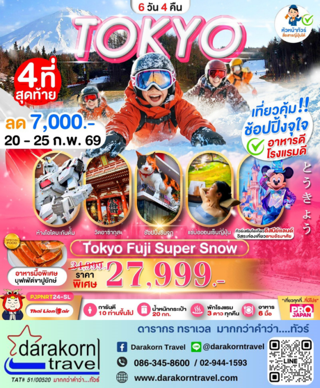 โปรไฟไหม้ ทัวร์ญี่ปุ่น TOKYO FUJI SUPER SNOW 6วัน4 คืน โปรแรง ลดราคา 7,000 บาท จองด่วน เหลือ4ที่สุดท้าย Posted on February 9, 2026 by Sales Darakorn Travel 09 Feb ทัวร์ญี่ปุ่น TOKYO FUJI SUPER SNOW 6วัน4 คืน โปรแรง ลดราคา 7,000 บาท จองด่วน เหลือ4ที่สุดท้าย วัดอาซากุสะ ช้อปปิ้งชินจูกุ แช่บ่อออนเซ็น ห้างโอไดบะซิตี้ วันเดินทาง 20 – 25 ก.พ. 69 จากราคา 34,999.- เหลือเพียง 27,999.- Facebook iconFacebookTwitter iconTwitterLINE iconLine Sales Darakorn Travel ทัวร์ญี่ปุ่น TOKYO FUJI SUPER SNOW 6วัน4 คืน โปรแรง ลดราคา 8,000 บาท จองด่วน เหลือ3ที่สุดท้าย ทัวร์ญี่ปุ่น TOKYO ATAMI FUJI 5วัน3 คืน โปรแรง ลดราคา 10,000 บาท จองด่วน เหลือ7ที่สุดท้าย