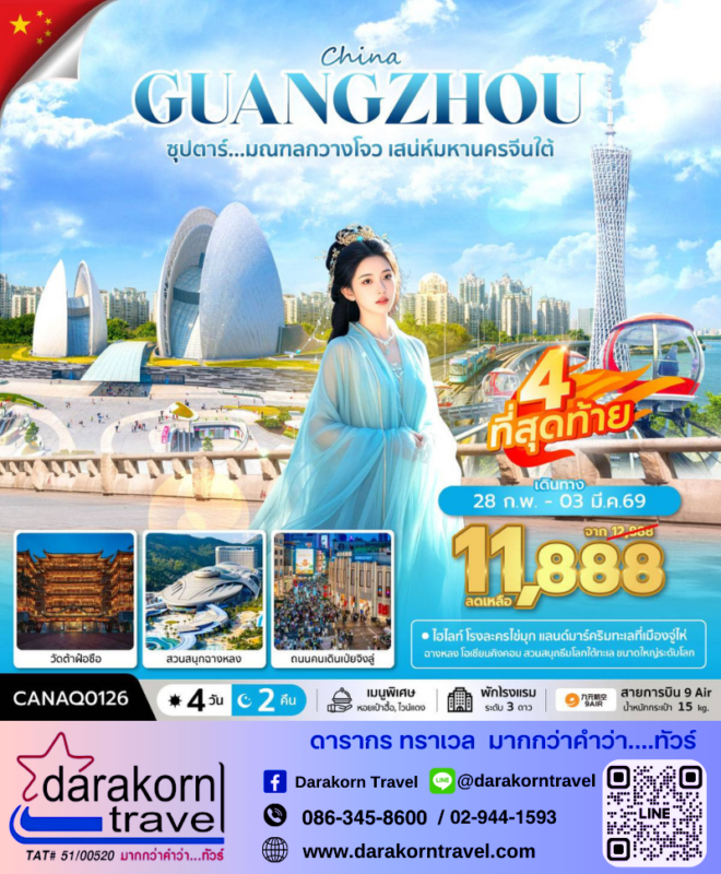 โปรไฟไหม้ ทัวร์จีน ซุปตาร์..มณฑลกวางโจว 4วัน2 คืน โปรแรง ลดราคา 1,000 บาท จองด่วน 4 ที่สุดท้าย Posted on February 10, 2026 by Sales Darakorn Travel 10 Feb ทัวร์จีน ซุปตาร์..มณฑลกวางโจว 4วัน2 คืน โปรแรง ลดราคา 1,000 บาท จองด่วน 4 ที่สุดท้าย โรงละครไข่มุก ฉางหลง โอเชี่ยนคิงคอม วัดต้าฝ่อชือ สะพานหนานเฉียว วันเดินทาง 28 ก.พ. – 03 มี.ค. 69 จากราคา 12,888.- เหลือเพียง 11,888.- Facebook iconFacebookTwitter iconTwitterLINE iconLine Sales Darakorn Travel ทัวร์จีน เฉิงตู สี่ดรุณี ปี้เผิงโกว อัญมณีแห่งเสฉวน 5วัน4 คืน โปรแรง ลดราคา 3,000 บาท จองด่วน