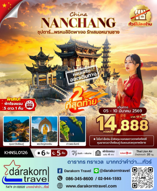 โปรไฟไหม้ ทัวร์จีน ซุปตาร์..พรหมลิขิตพาเจอ รักเสมอหนานชาง 6วัน5คืน โปรแรง ลดราคา 3,000 บาท จองด่วน 2ที่สุดท้าย Posted on February 11, 2026 by Sales Darakorn Travel 11 Feb ทัวร์จีน ซุปตาร์..พรหมลิขิตพาเจอ รักเสมอหนานชาง 6วัน5คืน โปรแรง ลดราคา 3,000 บาท จองด่วน 2ที่สุดท้าย อ่าวพระจันทร์ พระใหญ่ตงหลิน หุบเขาวังเซียนกู่ ดินแดนสวยดุจเทพนิยาย หอคอยดาวตกแห่งเจียงซี วันเดินทาง 05 – 10 มี.ค. 69 จากราคา 17,888.- เหลือเพียง 14,888.- Facebook iconFacebookTwitter iconTwitterLINE iconLine Sales Darakorn Travel ทัวร์จีน ซุปตาร์..คุนหมิงบู๊สบู๊ส 4วัน3 คืน โปรแรง ลดราคา 1,000 บาท จองด่วน 9ที่สุดท้าย ทัวร์ญี่ปุ่น ฮอกไกโด Mombetsu Asahikawa 6วัน5คืน โปรแรง ลดราคา 8,000 บาท จองด่วน