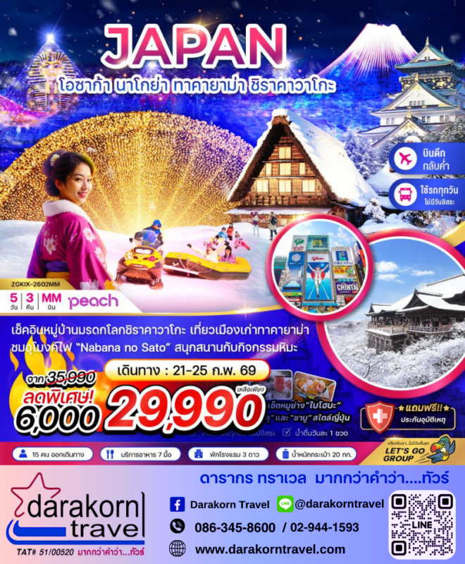 โปรไฟไหม้ ทัวร์ญี่ปุ่น โอซาก้า นาโกย่า ชิราคาวาโกะ 5วัน3คืน โปรแรง ลดราคา 6,000 บาท จองด่วน Posted on February 12, 2026 by Sales Darakorn Travel 12 Feb ทัวร์ญี่ปุ่น โอซาก้า นาโกย่า ชิราคาวาโกะ 5วัน3คืน โปรแรง ลดราคา 6,000 บาท จองด่วน ชิราคาวาโกะ เที่ยวเมืองเก่าทาคายาม่า ชมอุโมงค์ไฟ นาบานะ ซาโตะ สนุกสนานกับกิจกรรมหิมะ วันเดินทาง 21 – 25 ก.พ. 69 จากราคา 35,990.- เหลือเพียง 29,990.- Facebook iconFacebookTwitter iconTwitterLINE iconLine Sales Darakorn Travel ทัวร์ญี่ปุ่น โอซาก้า นาโกย่า ทาคายาม่า เกียวโต 6วัน4คืน โปรแรง ลดราคา 10,000 บาท จองด่วน