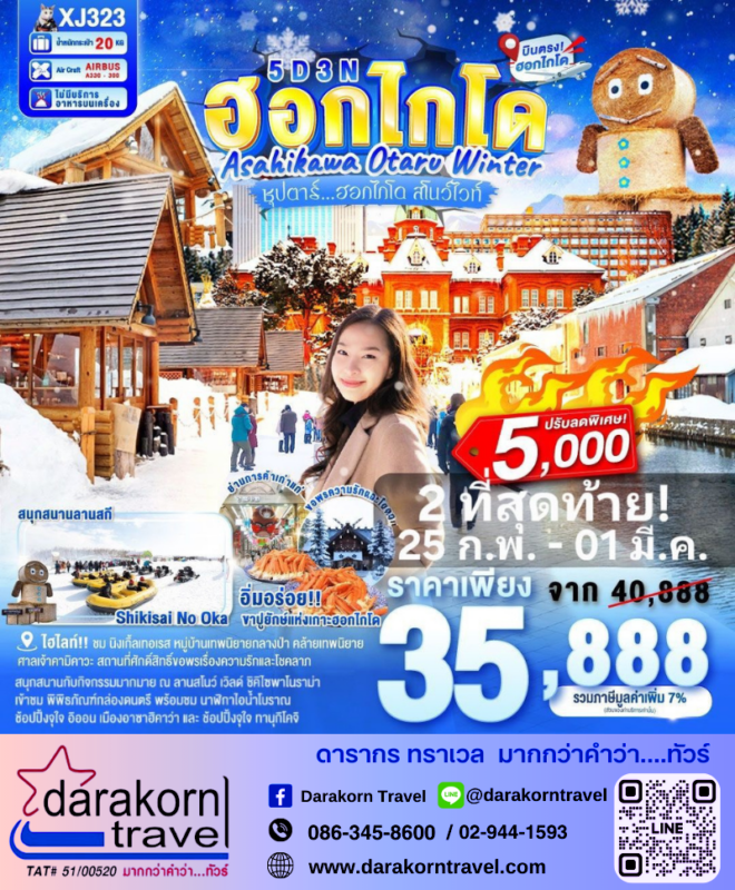 โปรไฟไหม้ ทัวร์ญี่ปุ่น HOKKAIDO ASAHIKAWA Winter 5วัน3คืน โปรแรง ลดราคา 5,000 บาท จองด่วน 2 ที่สุดท้าย Posted on February 16, 2026 by Sales Darakorn Travel 16 Feb ทัวร์ญี่ปุ่น HOKKAIDO ASAHIKAWA Winter 5วัน3คืน โปรแรง ลดราคา 5,000 บาท จองด่วน 2 ที่สุดท้าย สัมผัสประสบการณ์ ล่องเรือตัดน้ำแข็ง ณ มอนเบทสึ เทศกาลหิมะเมืองโซฮุนเคียว สวนสัตว์อาซาฮิยาม่า บุฟเฟ่ต์ขาปูยักษ์ วันเดินทาง 25 ก.พ. 01 มี.ค.69 จากราคา 40,888.- เหลือเพียง 35,888.- Facebook iconFacebookTwitter iconTwitterLINE iconLine Sales Darakorn Travel ทัวร์ญี่ปุ่น TOKYO Fuji Snow Winter 5วัน3คืน โปรแรง ฟรีพักเดี่ยว ทัวร์ญี่ปุ่น HOKKAIDO MOMBETSU ASAHIKAWA 6วัน4คืน โปรแรง ลดราคา 8,000 บาท จองด่วน
