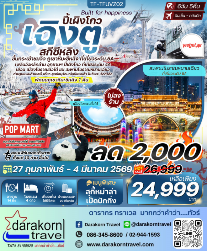โปรไฟไหม้ ทัวร์จีน เฉิงตู สกีซีหลิง ปี้เผิงโกว 6วัน5คืน โปรแรง ลดราคา 2,000 บาท จองด่วน Posted on February 17, 2026 by Sales Darakorn Travel 17 Feb ทัวร์จีน เฉิงตู สกีซีหลิง ปี้เผิงโกว 6วัน5คืน โปรแรง ลดราคา 2,000 บาท จองด่วน ขึ้นกระเช้าชมวิว ภูเขาหิมะซีหลิง เมืองโบราณลั่วใต้ สะพานโบราณหนานเฉียว วัดต้าฉือ วันเดินทาง 27ก.พ. – 04 มี.ค.69 จากราคา 26,999.- เหลือเพียง 24,999.- Facebook iconFacebookTwitter iconTwitterLINE iconLine Sales Darakorn Travel ทัวร์ญี่ปุ่น โตเกียว นาริตะ มัตสึดะซากุระ 5วัน3คืน โปรแรง ลดราคา 4,000 บาท จองด่วน ทัวร์จีน เฉิงตู สกีซีหลิง ปี้เผิงโกว 6วัน5คืน โปรแรง ลดราคา 2,000 บาท จองด่วน