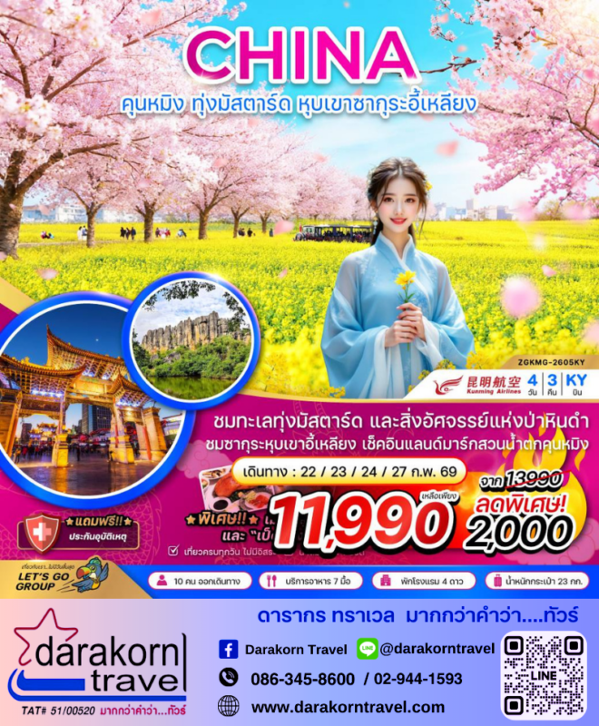 โปรไฟไหม้ ทัวร์จีน คุนหมิง ทุ่งมัสตาร์ด 4วัน3คืน โปรแรง ลดราคา 2,000 บาท จองด่วน Posted on February 18, 2026 by Sales Darakorn Travel 18 Feb ทัวร์จีน คุนหมิง ทุ่งมัสตาร์ด 4วัน3คืน โปรแรง ลดราคา 2,000 บาท จองด่วน ชมทะเลทุ่งมัสตาร์ด ป่าหินดำ หุบเขาซากุระอี้เหลียง สวนน้ำตกคุนหมิง วันเดินทาง 22/23/24/27 ก.พ.69 จากราคา 13,990.- เหลือเพียง 11,990.- Facebook iconFacebookTwitter iconTwitterLINE iconLine Sales Darakorn Travel ทัวร์ญี่ปุ่น โอซาก้า ทาคายาม่า ชิราคาวาโกะ เทศกาลดอกบ๊วย 5วัน3คืน โปรแรง ลดราคา 6,000 บาท จองด่วน
