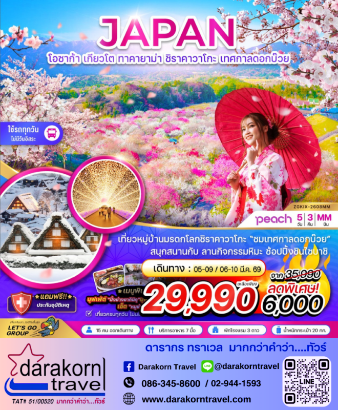โปรไฟไหม้ ทัวร์ญี่ปุ่น โอซาก้า ทาคายาม่า ชิราคาวาโกะ เทศกาลดอกบ๊วย 5วัน3คืน โปรแรง ลดราคา 6,000 บาท จองด่วน Posted on February 18, 2026 by Sales Darakorn Travel 18 Feb ทัวร์ญี่ปุ่น โอซาก้า ทาคายาม่า ชิราคาวาโกะ เทศกาลดอกบ๊วย 5วัน3คืน โปรแรง ลดราคา 6,000 บาท จองด่วน หมู่บ้านชิราคาวาโกะ ชมเทศกาลดอกบ๊วย สนุกสนานกับลานกิจกรรมหิมะ ช้อปปิ้งย่านดังชินไซบาชิ วันเดินทาง 05-09/06-10 มี.ค.69 จากราคา 35,990.- เหลือเพียง 29,990. Facebook iconFacebookTwitter iconTwitterLINE iconLine Sales Darakorn Travel ทัวร์ญี่ปุ่น โอซาก้า นาโกย่า ชิราคาวาโกะ 5วัน3คืน โปรแรง ลดราคา 3,000 บาท จองด่วน ทัวร์จีน คุนหมิง ทุ่งมัสตาร์ด 4วัน3คืน โปรแรง ลดราคา 2,000 บาท จองด่วน
