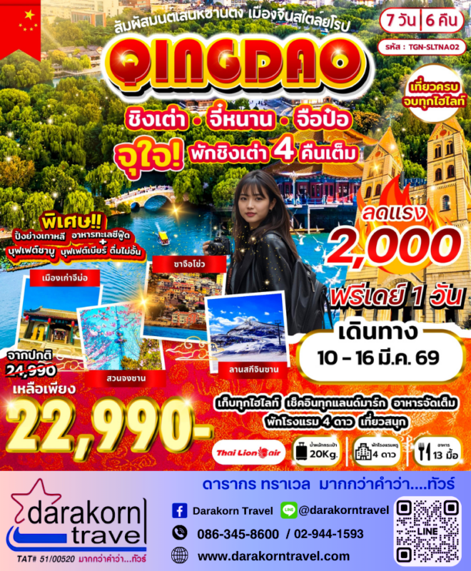 โปรไฟไหม้ ทัวร์จีน ชิงเต่า จี๋หนาน จือป๋อ 7วัน6คืน โปรแรง ลดราคา 2000 บาท จองด่วน Posted on February 27, 2026 by Sales Darakorn Travel 27 Feb ทัวร์จีน ชิงเต่า จี๋หนาน จือป๋อ 7วัน6คืน โปรแรง ลดราคา 2000 บาท จองด่วน สวนจงซาน ลานสกีจินซาน ซาจือโข่ว เมืองเก่าจีม่อ วันเดินทาง 10-16 มี.ค.69 จากราคา 24,990.- เหลือเพียง 22,990.- Facebook iconFacebookTwitter iconTwitterLINE iconLine Sales Darakorn Travel ทัวร์ญี่ปุ่น โอซาก้า เกียวโต ทาคายาม่า 5วัน3คืน โปรแรง ลดราคา 4000 บาท จองด่วน ทัวร์จีน เซี่ยงไฮ้ ดิสนีย์แลนด์ 5วัน3คืน โปรแรง ลดราคา 2000 บาท จองด่วน